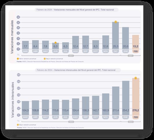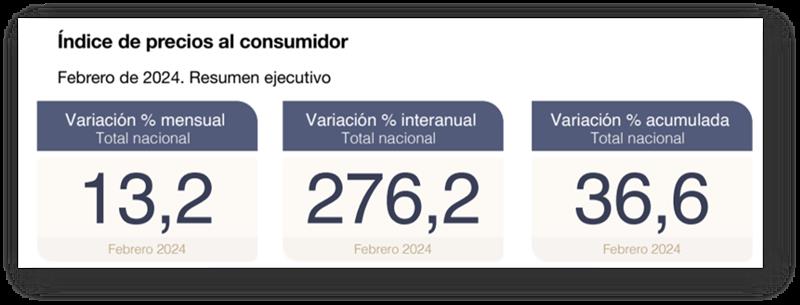 El nivel general del Índice de precios al consumidor (IPC) representativo del total de hogares del país registró en febrero una variación de 13,2% con relación al mes anterior, el primer bimestre acumuló una suba del 36,6% y la variación interanual fue del 276,2%.