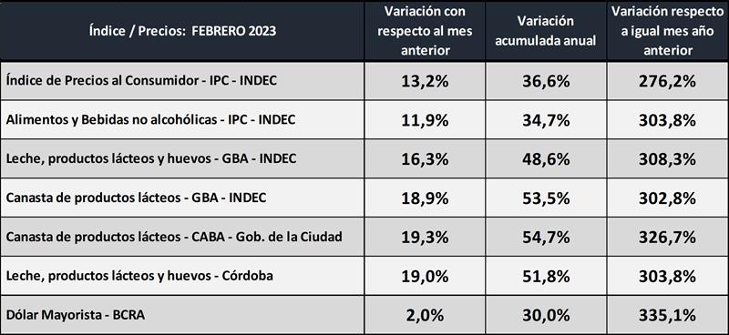 Como se indica más arriba en función de diferentes índices, los precios de los productos lácteos tuvieron una variación interanual promedio del 305%, cuando la inflación minorista fue de 276%, los alimentos y bebidas no alcohólicas aumentaron un 304% en el año y el dólar oficial BCRA tuvo una variación interanual del 335%, lo que indica que los precios de los lácteos subieron interanualmente por encima de la inflación general, prácticamente igual que los alimentos, y estuvieron por encima de la leche cruda que tuvo un aumento interanual del 294% (precio SIGLeA por litro).