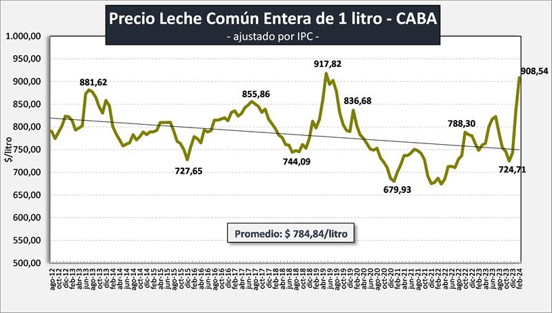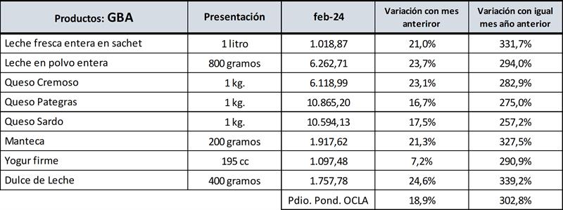 Según datos publicados por la Dirección General de Estadísticas y Censos - Ministerio de Hacienda del Gobierno de la Ciudad de Buenos Aires, los precios de los productos lácteos de esta canasta, tuvieron un crecimiento mensual promedio ponderado del 19,3%, y un incremento interanual del 326,7%. El ponderado es elaborado por OCLA sobre el mismo criterio mencionado para la canasta GBA de INDEC.