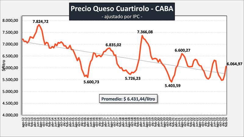 En el caso del queso cuartirolo mantiene también una tendencia decreciente en la serie de 11 años. El precio de febrero está 5,7% por debajo de la media y 22,5% por debajo del máximo alcanzado en 2013.
