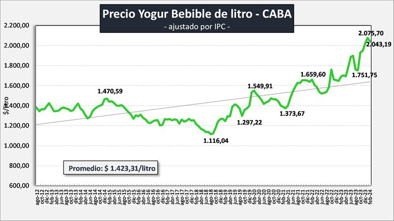 La situación de los yogures bebibles de litro es diferente, sostienen el nivel de consumo de la categoría, y sus precios se ajustan por encima del ritmo inflacionario, con algunos altibajos. El precio actual está 43,6% encima de la media de la serie. Lamentablemente tiran para abajo el promedio del mix, ya que su aumento de ventas no fue acompañado por las ventas de yogures en pote, postres y flanes que tienen un mayor valor por litro equivalente.