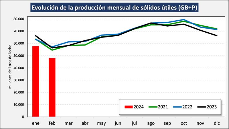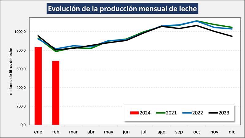 En el mes de febrero del 2024 la producción fue de 686 millones de litros de leche, esto implica un valor 12,1% por debajo del mes anterior y un 17,8% menos que igual mes del año anterior.