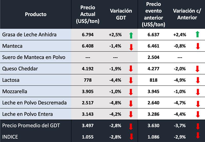 -GDT Price Index indica el promedio del cambio porcentual en los precios para cada especificación, ponderado por la cantidad de cada especificación vendida. GDT proporciona un cambio en el índice de precios de GDT del evento anterior para todos los productos, además de un equivalente para cada grupo de productos y cada combinación de grupo de productos/período de contrato. El índice de precios proporciona un reflejo más preciso de los movimientos de precios entre los eventos comerciales.