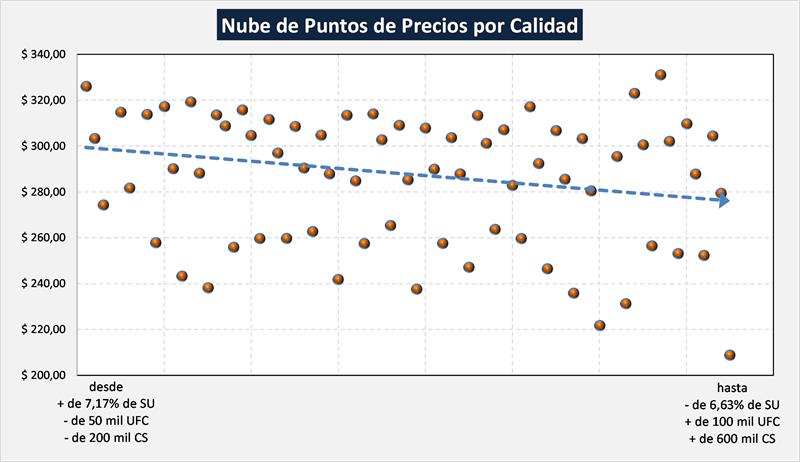 Si elaboramos una nube de puntos con los diferentes precios disponibles en función a las calidades, podemos observar que se da una pendiente descendente de precios a medida que es menor la calidad integral de la leche, pero esa pendiente podría ser mucho más pronunciada si se pretende mejorar/incentivar la mejor calidad de leche.