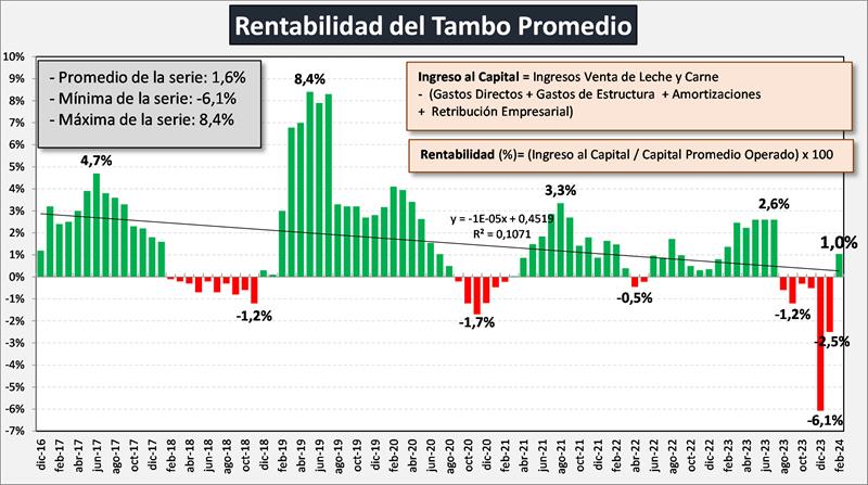 Como lo veníamos informando en oportunidades anteriores se había producido un fuerte desacople en diciembre (por la devaluación y alta inflación), entre precios y costos y señalábamos que los precios de la leche venían creciendo por encima de la inflación y que pronto se produciría la convergencia, es por ello que ya en febrero se puede observar una tasa de rentabilidad positiva (1,04%). Cabe aclara que a pesar de ello no se logra el Precio de Equilibrio ($ 330,71 para feb/24) que exige una rentabilidad mínima del 5% como Costos de Oportunidad del Capital Invertido.