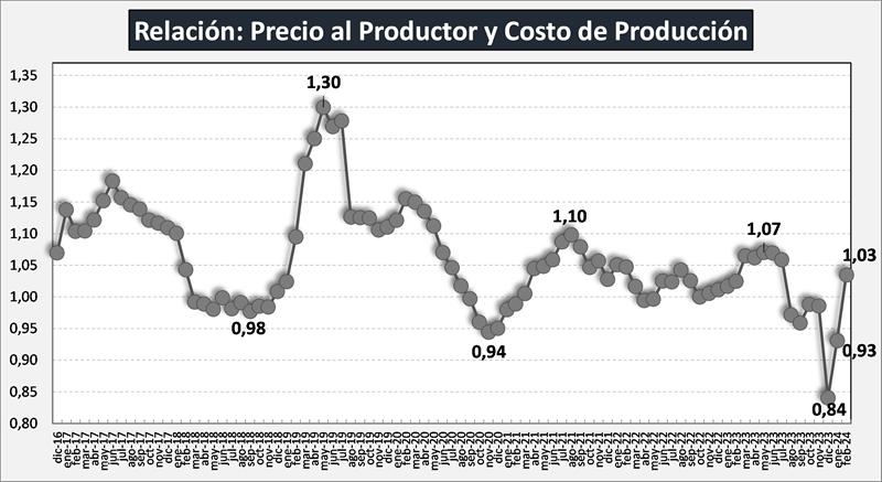 El gráfico superior muestra la relación entre el precio percibido y el costo de producción, que cuando el factor supera 1 el precio es superior al costo.