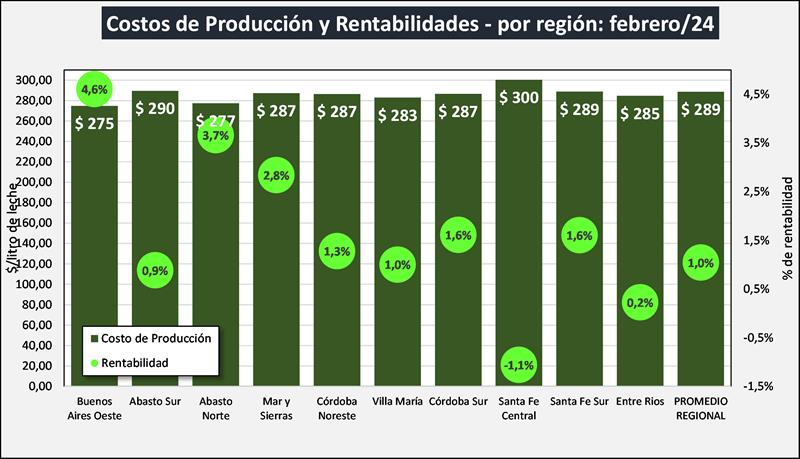 Al ser el Costo de Producción Promedio de $ 288,72/lt. y la Rentabilidad Promedio de 1,04%, ambos valores surgen a su vez de los promedios ponderados de las 10 regiones mencionadas y para los tres estratos considerados. En el gráfico superior se puede observar el costo y la rentabilidad de cada región productiva, mostrando claramente la gran dispersión, muy vinculada con las diferentes escalas y productividades.