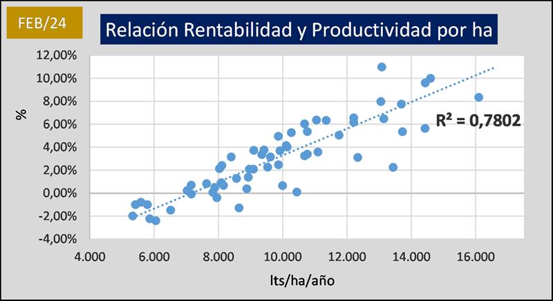 Por último, incorporamos el gráfico donde se obtiene la mayor correlación entre las variables económicas y productivas, en este caso la relación entre la Productividad (medida en litros de leche por hectárea y por año) y la Rentabilidad obtenida.