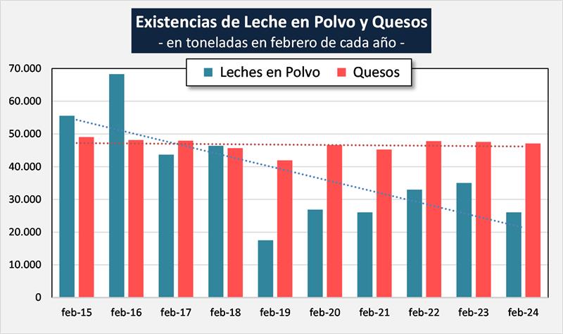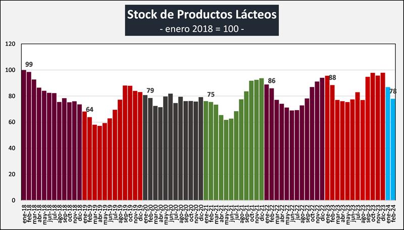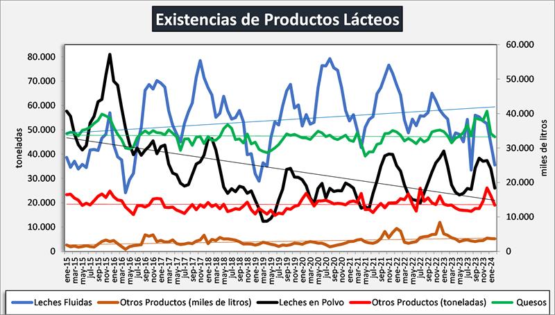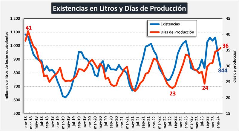 En el mes de febrero de 2024 las existencias fueron 13,9% inferiores al mes anterior (-8,0% en promedio diario) y en litros de leche equivalentes estuvieron en 844 millones de litros de leche equivalentes, un 10,4% por debajo del mes anterior (-4,2% en el promedio diario).