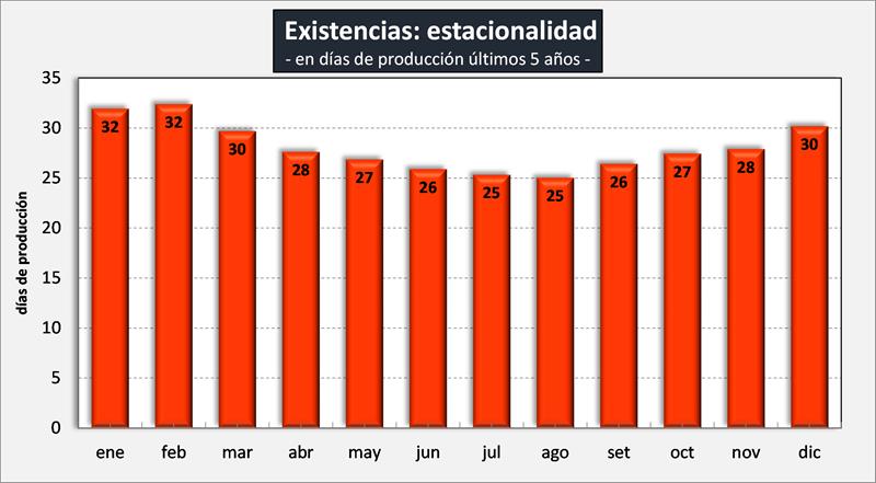 En el primer bimestre del año los stocks iniciales cayeron un 24,8% en volumen y 20,4% en el promedio diario. A pesar de ello medidos tanto en días de producción como en días de consumo fueron 7,2% y 18% superiores a igual mes del año pasado, respectivamente.