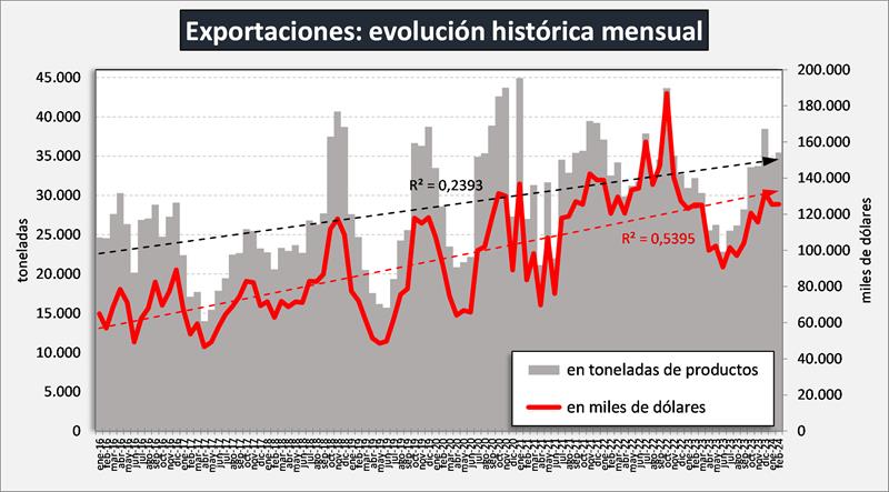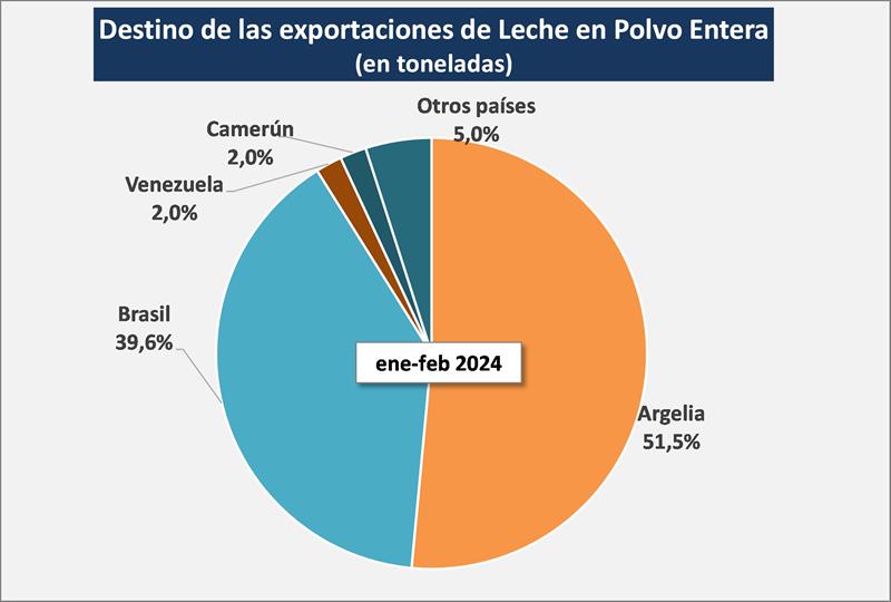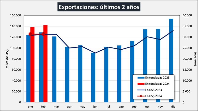 En litros de leche equivalentes, las exportaciones crecieron el 17,0% y representaron el 32,4% de la producción total (en enero-febrero de 2023 representaron el 23,9%). En particular, febrero de 2024 tuvo una participación de las exportaciones del 35,5% sobre la producción total del mes.