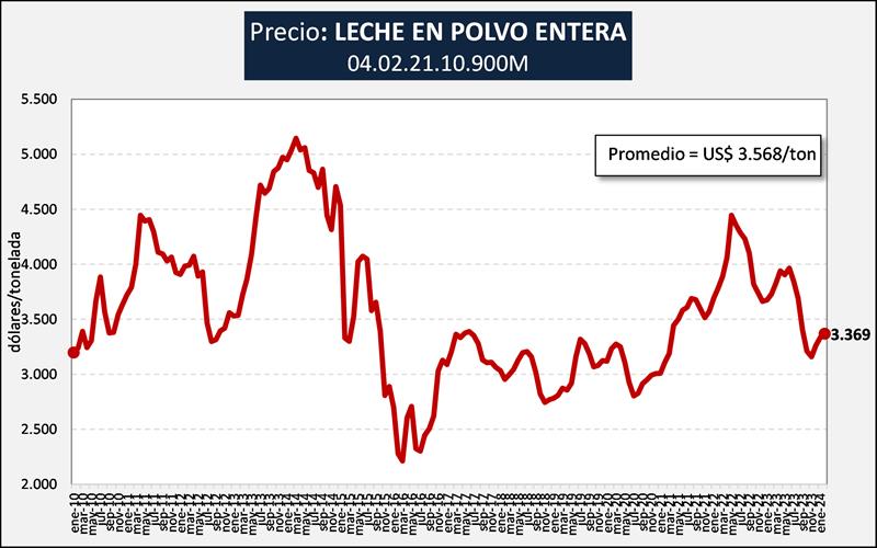 En el gráfico siguiente se puede observar la evolución del precio de la Leche en Polvo Entera en bolsas de 25 kgs. con el nomenclador Común Arancelario 04.02.21.10 900M actualizado hasta el mes de febrero de 2024: