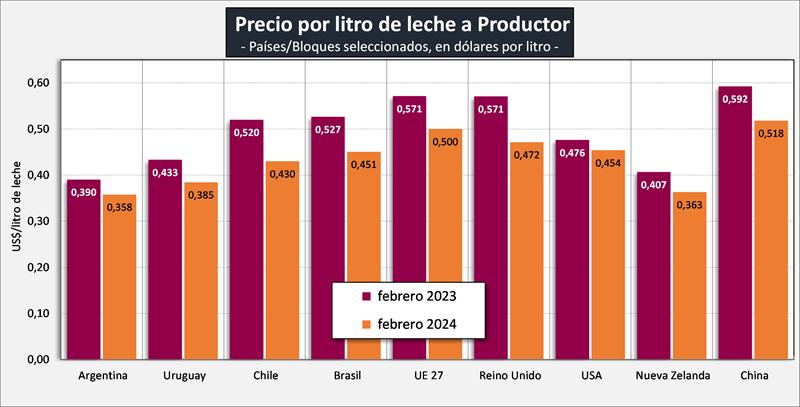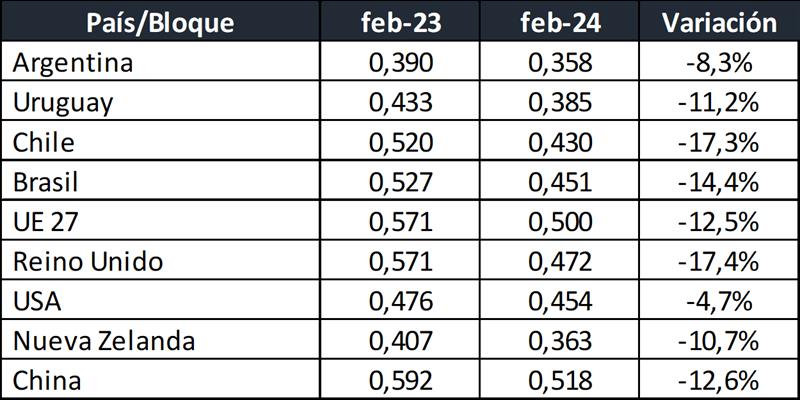 Fuentes: DNL-MAGyP, INALE, ODEPA, CEPEA/ESALQ USP, EMMO, AHDB, USDA y CLAL, respectivamente.