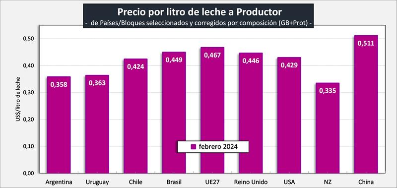 Observaciones: los precios en el gráfico de arriba han sido corregidos sólo por sólidos útiles (grasa butirosa y proteína) y no por el resto de atributos que hacen a la calidad higiénica y sanitaria, ni tampoco por tipo de cambio real bilateral con cada uno de esos países/bloques.