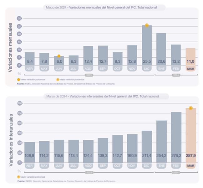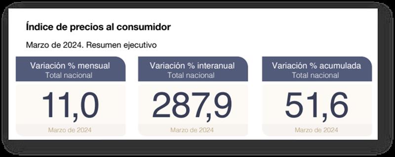 El nivel general del Índice de precios al consumidor (IPC) representativo del total de hogares del país registró en marzo una variación de 11,0% con relación al mes anterior, el primer trimestre acumuló una suba del 51,6% y la variación interanual fue del 287,9%.