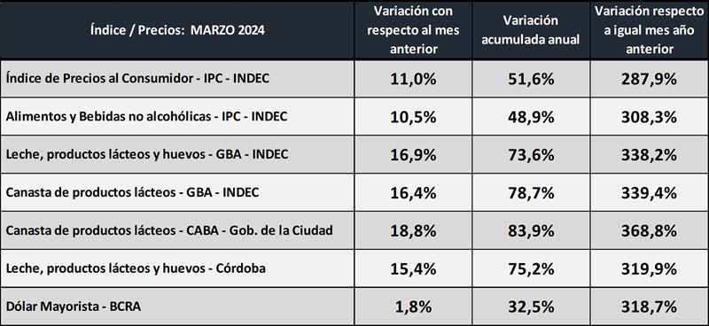 Como se indica más arriba en función de diferentes índices, los precios de los productos lácteos tuvieron una variación interanual promedio del 340%, cuando la inflación minorista fue de 288%, los alimentos y bebidas no alcohólicas aumentaron un 308% en el año y el dólar oficial BCRA tuvo una variación interanual del 319%, lo que indica que los precios de los lácteos subieron interanualmente por encima de la inflación general, de los alimentos, y estuvieron por encima de la leche cruda que tuvo un aumento interanual del 307% (precio SIGLeA por litro).