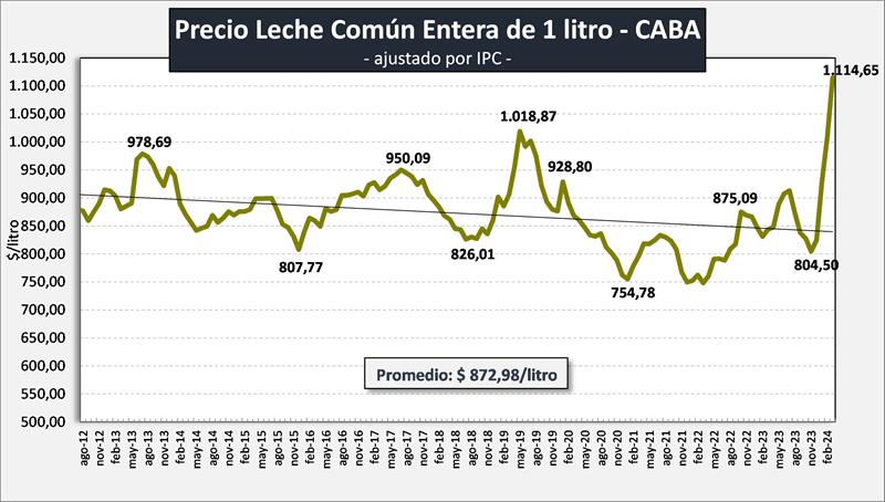 Según datos publicados por la Dirección General de Estadísticas y Censos - Ministerio de Hacienda del Gobierno de la Ciudad de Buenos Aires, los precios de los productos lácteos de esta canasta, tuvieron un crecimiento mensual promedio ponderado del 18,8%, y un incremento interanual del 368,8%. El ponderado es elaborado por OCLA sobre el mismo criterio mencionado para la canasta GBA de INDEC.