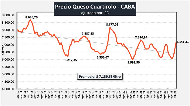 En el caso del queso cuartirolo mantiene también una tendencia decreciente en la serie de 13 años. El precio de marzo fue 0,02% superior a la media histórica disponible y estuvo 17,8% por debajo del máximo alcanzado en 2013.