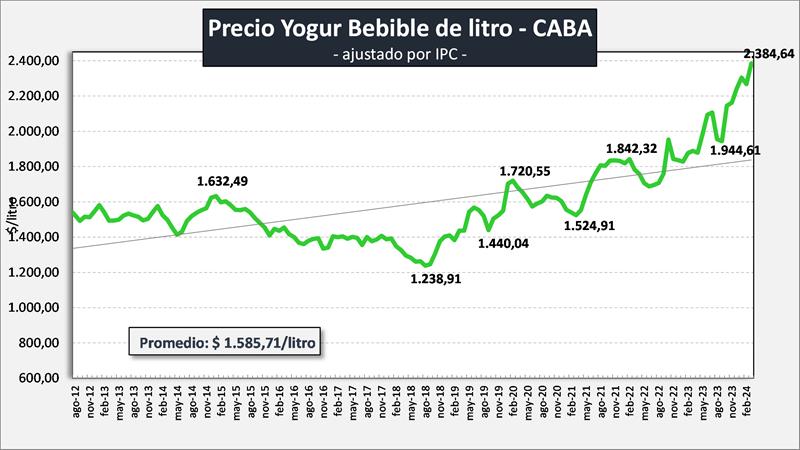 La situación de los yogures bebibles de litro es diferente, sostienen el nivel de consumo de la categoría, y sus precios se ajustan por encima del ritmo inflacionario, con algunos altibajos. El precio actual está 50,4% por encima de la media de la serie. Lamentablemente tiran para abajo el promedio del mix, ya que su aumento de ventas no fue acompañado por las ventas de yogures en pote, postres y flanes que tienen un mayor valor por litro equivalente.