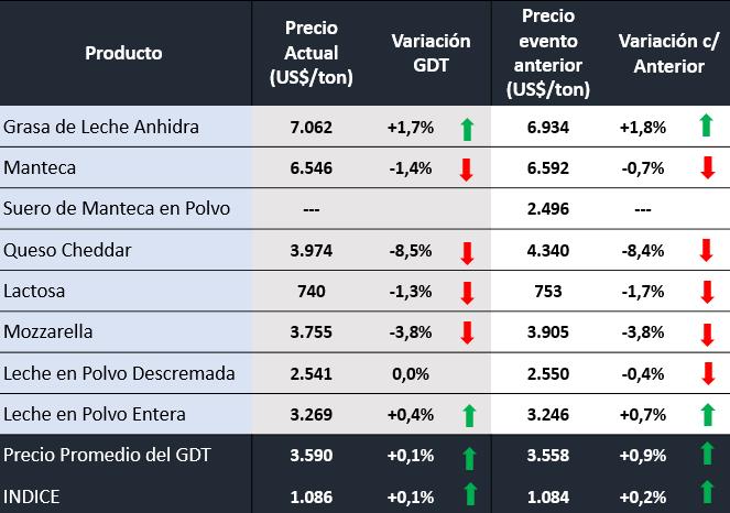 -GDT Price Index indica el promedio del cambio porcentual en los precios para cada especificación, ponderado por la cantidad de cada especificación vendida. GDT proporciona un cambio en el índice de precios de GDT del evento anterior para todos los productos, además de un equivalente para cada grupo de productos y cada combinación de grupo de productos/período de contrato. El índice de precios proporciona un reflejo más preciso de los movimientos de precios entre los eventos comerciales.