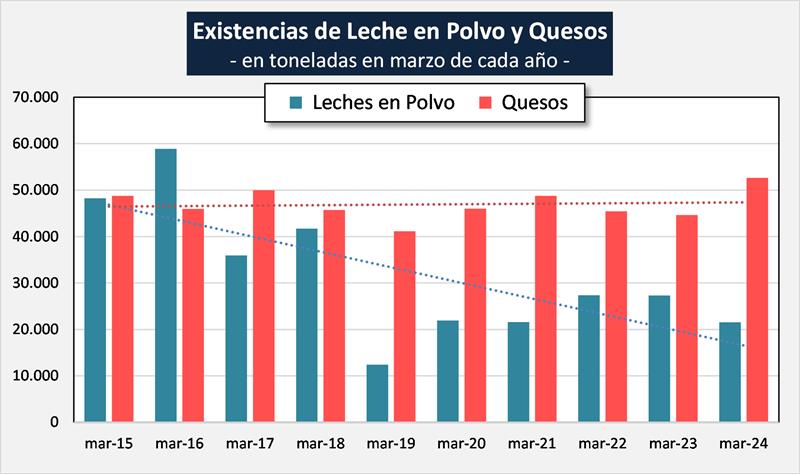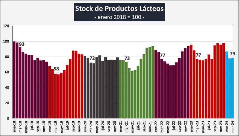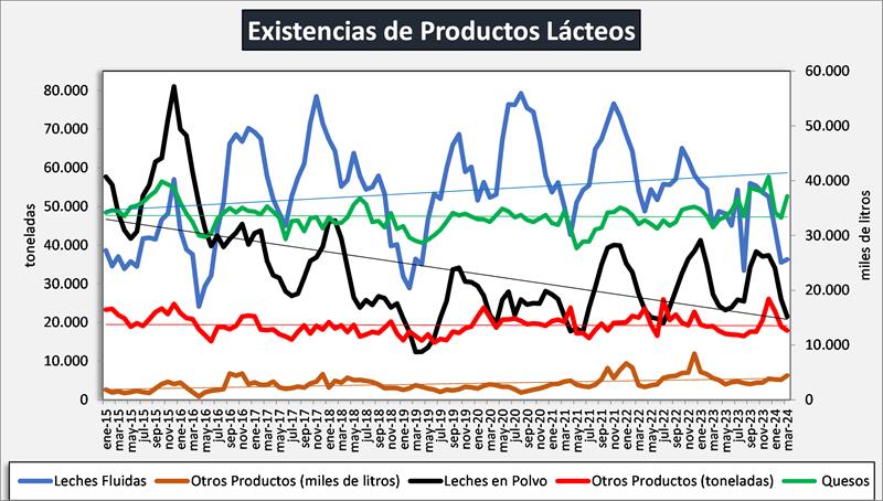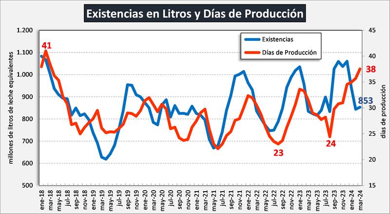 En el mes de marzo de 2024 las existencias fueron 1,1% superiores al mes anterior y en litros de leche equivalentes estuvieron en 853 millones de litros de leche equivalentes, un 1,1% por encima del mes anterior (-5,4% en el promedio diario). Respecto al interanual, marzo 2024 estuvo -3,7% y +2,2% en volumen y litros de leche equivalentes respectivamente respecto de marzo de 2023.