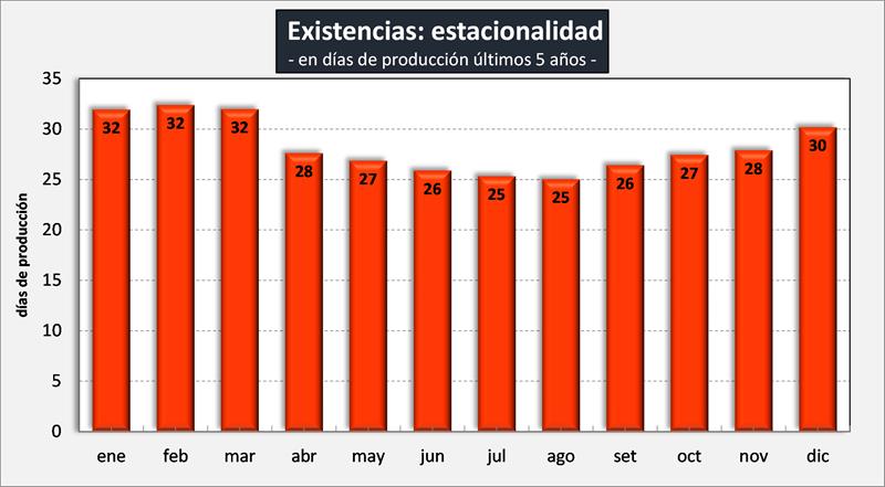 Estacionalidad de las existencias de productos lácteos en días de producción de leche, en los últimos 5 años: