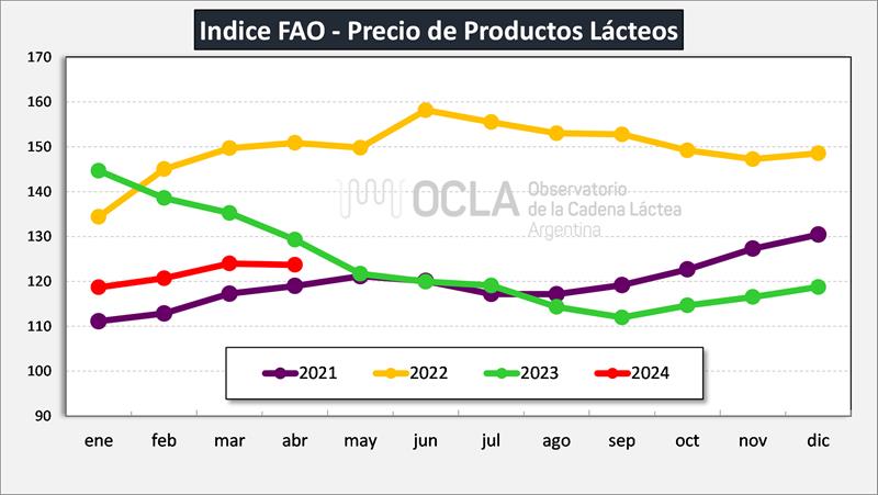 El índice de precios de los productos lácteos de la FAO registró un promedio de 123,7 puntos en abril, valor levemente inferior (0,3 puntos y un 0,3 %) al de marzo que representa una contracción tras seis meses de incremento continuo, si bien se mantenía 5,5 puntos (un 4,3 %) por debajo del valor registrado en el mismo mes del año pasado. Los precios internacionales de la leche en polvo descremada fueron los que más disminuyeron, sobre todo a raíz de la apatía de la demanda de importaciones de suministros al contado en un contexto de abundantes disponibilidades exportables, especialmente en Europa occidental. Por su parte, los precios mundiales del queso bajaron ligeramente, fundamentalmente a causa del fortalecimiento del dólar de los EE.UU. Por el contrario, los precios mundiales de la manteca siguieron aumentando debido a la constante demanda de importaciones y a unas existencias de manteca algo más reducidas en Europa occidental. Mientras tanto, los precios de la leche en polvo entera repuntaron moderadamente debido al aumento de la demanda de suministros a medio plazo y al descenso estacional de la producción de leche en Oceanía.