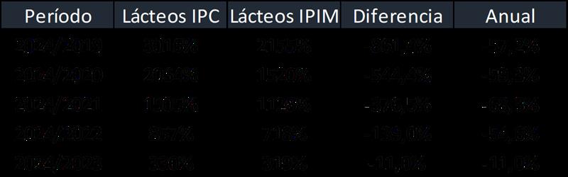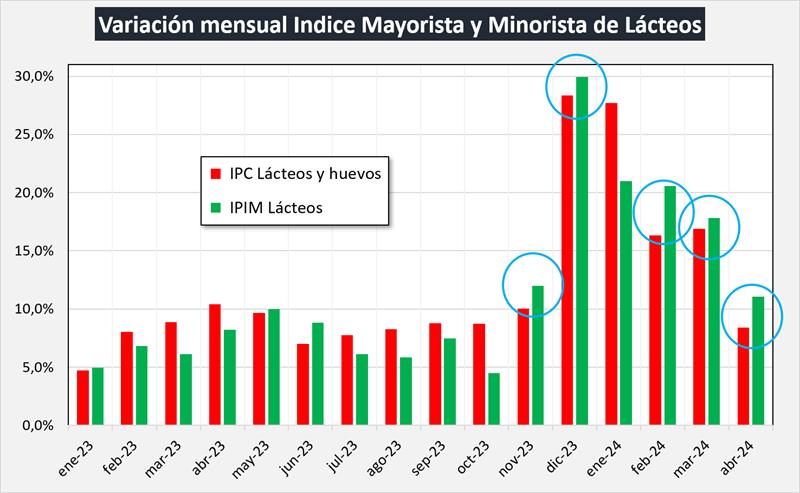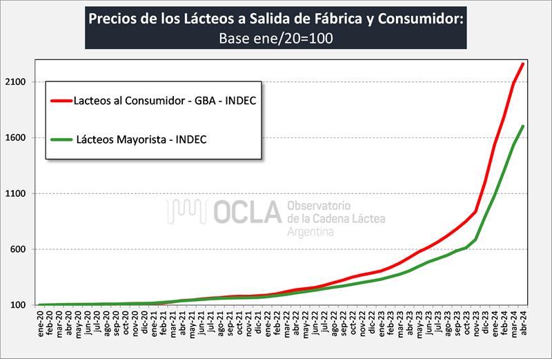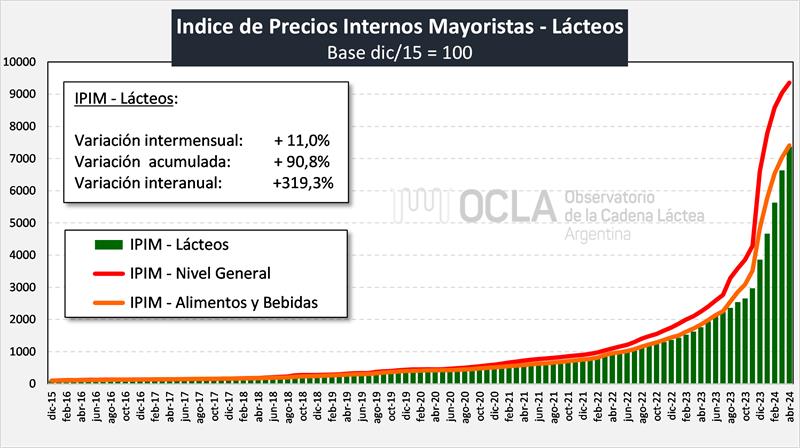 Índice de Precios Internos Mayoristas – IPIM – Lácteos – abril 2024 17/5/2024![]() IPIM – Nivel General – abril 2024 El nivel general del índice de precios internos al por mayor (IPIM) registró un aumento de 3,4% en abril de 2024 respecto del mes anterior, el acumulado del cuatrimestre subió 41,7% y el interanual subió 316,5%. IPIM – Alimentos y Bebidas – abril 2024 El índice mayorista de precios de Alimentos y Bebidas registró un aumento de 5,3% en abril de 2024 respecto del mes anterior, el 53,3% en el período enero-abril y la variación interanual fue del 301,3%. IPIM – Lácteos – abril 2024 El índice mayorista de precios de los Lácteos registró un aumento de 11,0% en abril de 2024 respecto del mes anterior, se incrementó un 90,8% en el 1° cuatrimestre del año y la comparación anual con abril de 2023 arrojó un incremento del 319,3%. ![]() En el cuadro superior puede observarse que los precios de los productos lácteos en su versión mayorista (Salida de Fábrica: al que vende la industria), se incrementaron apenas por arriba de mayorista general, pero 18 puntos por encima qué su propia categoría Alimentos y Bebidas en la variación interanual. En 2024 respecto a ambos parámetros el precio de los lácteos ha venido recuperando posiciones. En el gráfico de abajo, se observa claramente como los productos lácteos han tenido una recuperación en 2021 y lograron alcanzar a alimentos y bebidas (incluso lo superaron en algunos meses), y respecto al cual traían un importante retraso en el último trimestre de 2020 y el primer trimestre de 2021. Ya a fines de 2021 y en todo 2022 la variación de precios de Alimentos y Bebidas se comienza a ubicar por encima de la variación de precios de los productos lácteos, manteniéndose cercana entre abril y julio en 2023, y ya desde agosto próximo pasado los alimentos y bebidas superan holgadamente a los lácteos, retomando estos en los últimos meses. ![]() Al comparar el índice minorista de Leche, Productos Lácteos y huevos (+330,2% interanual) con los Precios Mayoristas de los Lácteos, se observa una brecha en detrimento de los precios en salida de fábrica de 11 puntos porcentuales. El diferencial se acrecienta a 50 puntos si comparamos los precios de los lácteos del índice de precios minoristas (con datos de GBA y CABA utilizando ponderación OCLA ya que no hay un índice exclusivo de lácteos minoristas nacional). ![]() En los últimos 5 años se observa un retraso importante en los precios mayoristas (salida de fábrica) con los minoristas (al consumidor), con tasas de diferencia superiores al 50% anual. Evidentemente el efecto control de precios que afectó el desenvolvimiento normal de la cadena en general, en particular, fue mucho más estricto en las listas de precios en salida de fábrica que en los precios en las góndolas. Es por ello que en los últimos meses se ha achicado ostensiblemente la brecha entre ambas variaciones de precios En el gráfico siguiente podemos observar cómo se desempeñaron los precios minoristas de los lácteos (lácteos y huevos GBA, que mide INDEC) y los precios mayoristas de los mismos (valor al que vende la industria o también denominado en salida de fábrica). La zona entre la línea roja y la línea verde, entre junio/21 y abril/24 indica el “diferencial de variación mensual” entre el precio que paga el consumidor y al que vende la industria (incremento del mark up), y allí se ve como existe en los últimos 35 meses, un diferencial en contra de los precios mayoristas de más de 40 puntos porcentuales. Esto marca claramente el retraso de precios de los productos lácteos en el valor al que factura la industria. ![]() La no existencia de controles de precios, la menor oferta debido a la menor producción y el incremento de exportaciones, hacen variar el diferencial de precios entre el valor de salida de fábrica y el precio que paga el consumidor. Los controles de precios que se aplicaban, tenían un estricto seguimiento en las listas de precios de las industrias, pero no ocurría lo mismo en la distribución minorista. El gráfico siguiente comienza a mostrar el posible cambio que mencionamos, ojalá que genere igual situación en los plazos de pago. ![]() elaborado por el OCLA con información de INDEC