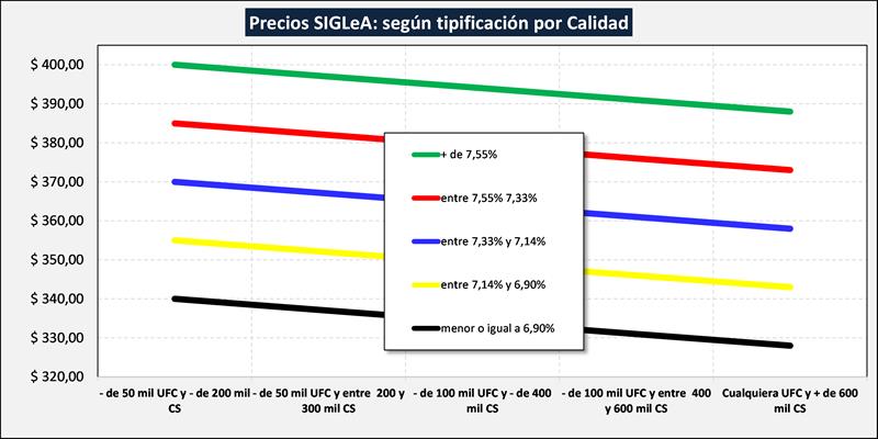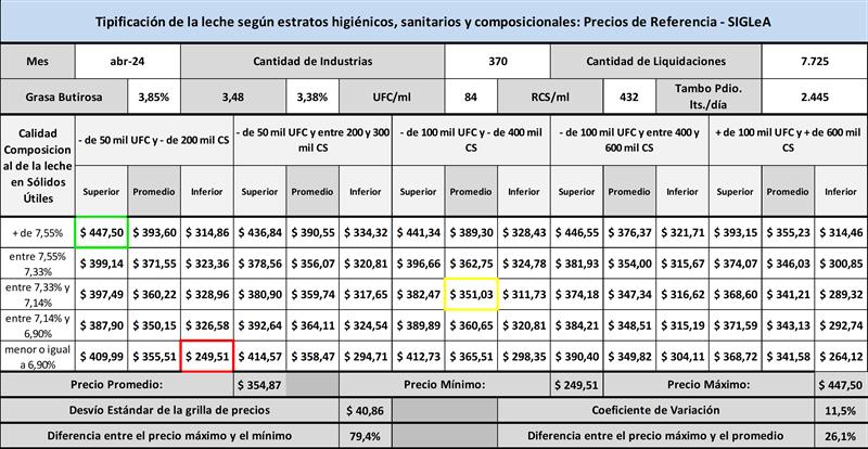 En el cuadro de tipificación, la leche comercializada se divide en 25 estratos según composición y calidad higiénico-sanitaria y, dentro de cada estrato, se muestra un promedio ponderado del precio del total de esos litros y además un promedio ponderado del 20% superior e inferior de los precios.