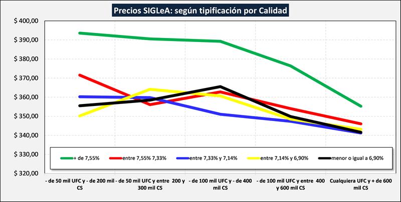 En el gráfico de arriba se presentan en 5 curvas por Tipo de leche en función a los sólidos útiles (grasa butirosa + proteína), los diferentes precios en función a la calidad higiénico-sanitaria (UFC/ml y RCS/ml). Se puede observar que existen precios descendentes en cada tipo composicional a medida que desmejora la calidad higiénico-sanitaria, pero se dan algunos serruchos ya que las “penalizaciones” por menor calidad se ven compensadas seguramente por la presencia de bonificaciones comerciales que pueden estar especificadas y tabuladas (ejemplo: volumen, temperatura, distancia, permanencia, etc.) o arbitrarias en función a aspectos no especificados en los Sistemas de Tipificación y Pago de la Leche (netamente comerciales).