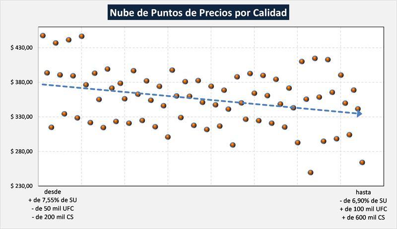 Si elaboramos una nube de puntos con los diferentes precios disponibles en función a las calidades, podemos observar que se da una pendiente descendente de precios a medida que es menor la calidad integral de la leche, pero esa pendiente podría ser mucho más pronunciada si se pretende mejorar/incentivar la mejor calidad de leche.