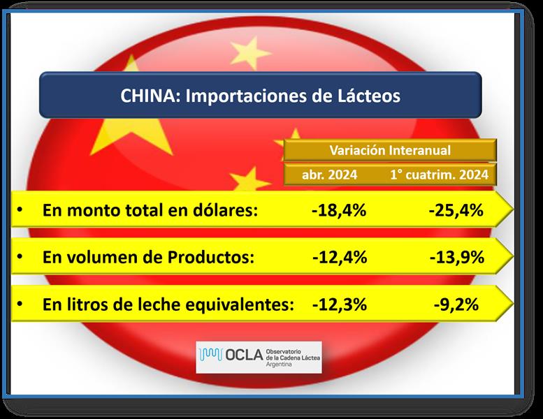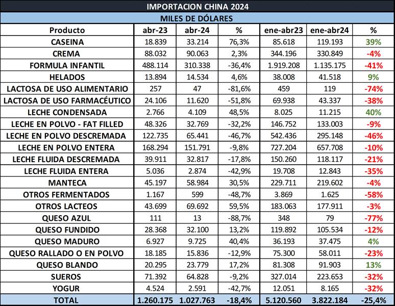 CHINA: importaciones de productos lácteos a enero-abril de 2024 23/5/2024