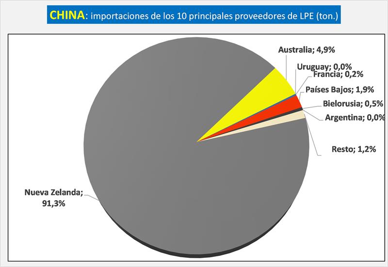 China es el principal importador de Leche en Polvo Entera y su principal proveedor es Nueva Zelanda quien ostentó el 91,3% de participación de ese producto en el gigante asiático en lo que va de 2024, casi idéntica a la participación del 2023 que fue del 91,0% para igual período.