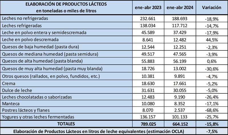 Según los datos del cuadro hay una caída del 15,8% en productos elaborados y del 7,5% en litros de leche necesarios para elaborarlos. Cabe recordar que la producción total a nivel nacional descendió en igual período un 15,2%.