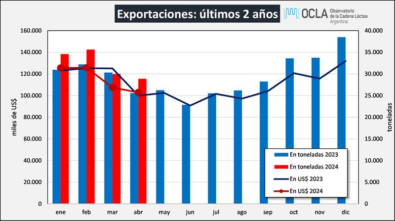 Las exportaciones de productos lácteos en abril de 2024 que totalizaron 28.867 toneladas de productos, por un valor de US$ 102,9 millones, bajaron 3,7%, y 4,3% en volumen de productos, y en monto total en dólares, respectivamente, comparadas con el mes anterior.