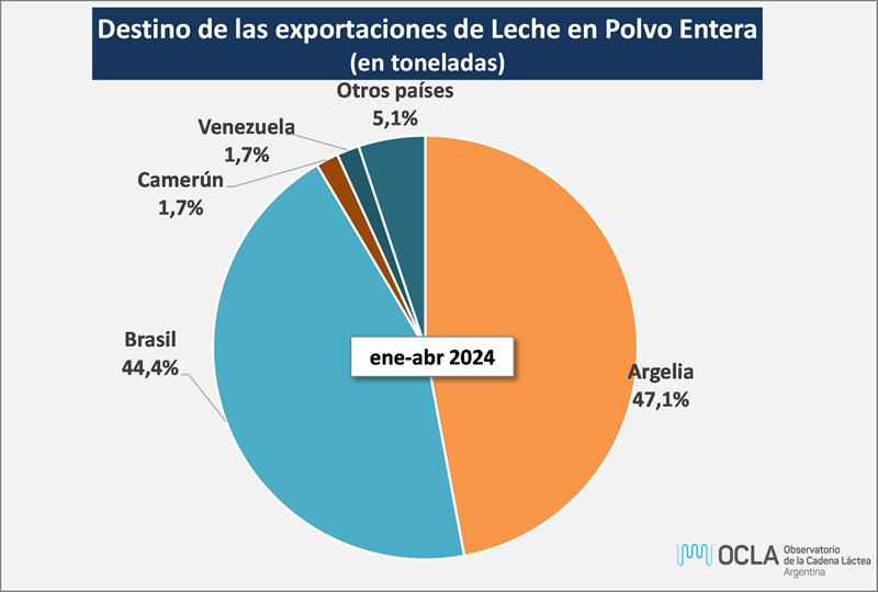 En litros de leche equivalentes (ene-abr 2024), las exportaciones crecieron el 9,6% y representaron el 29,3% de la producción total (en el primer cuatrimestre de 2023 representaron el 22,8%). En particular, abril de 2024 tuvo una participación de las exportaciones del 26,7% sobre la producción total del mes.