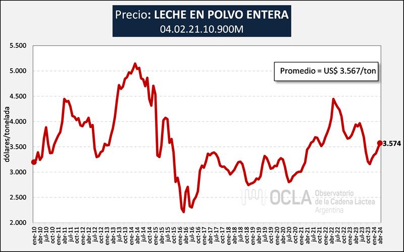 El precio medio de exportación por tonelada fue de US$ 3.577 para ene-abr de 2024, lo que implicó una caída del 10,1% respecto al año 2023. En el caso particular del rubro Leches en Polvo, el precio promedio fue de US$ 3.436/ton., un 10,1% por debajo del año anterior.