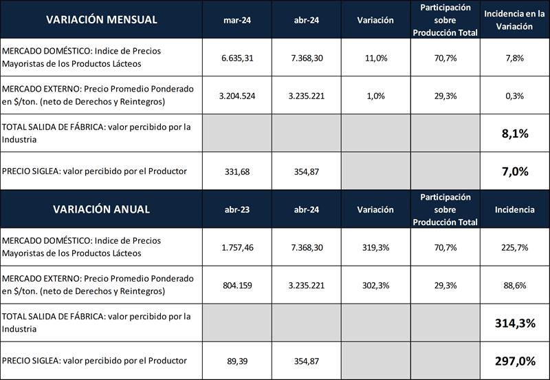 Este análisis trata de determinar la variación de precios de la industria y de la producción primaria. Se valoriza el ingreso de la industria en base a la proporción de leche que se destina a cada mercado y a los precios en que vende en cada uno de ellos. Para los precios de mercado interno se toma el Índice de Precios Mayoristas de los Lácteos de INDEC y para el mercado externo los precios en US$/ton., valorizados al tipo de cambio neto de exportación, en el caso del año anterior Dólar Mayorista BCRA neto de Derechos de Exportación y de Reintegros y para éste año el Dólar del Decreto 28/23 (80% dólar mayorista BCRA y 20% dólar contado con liquidación).