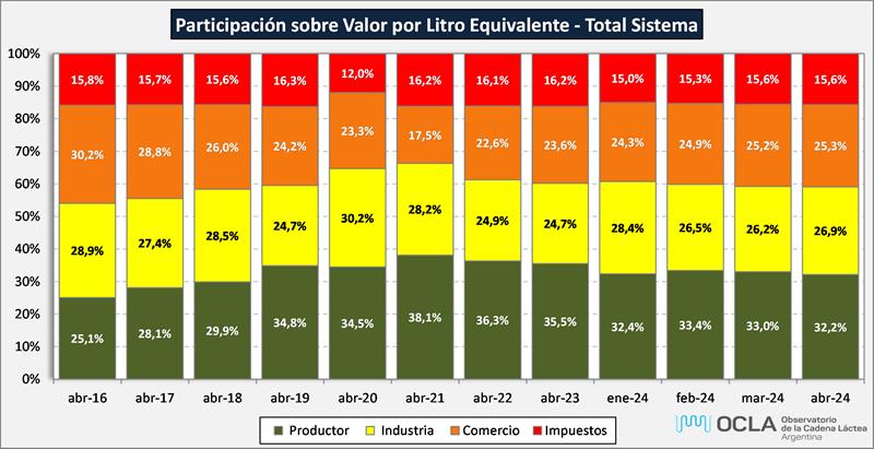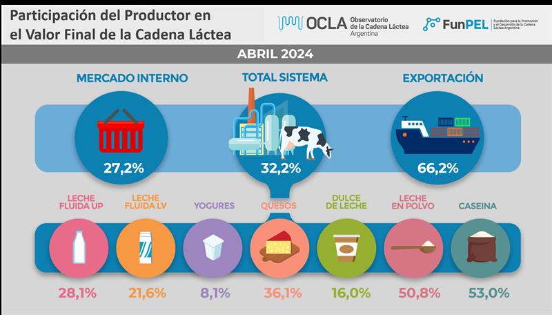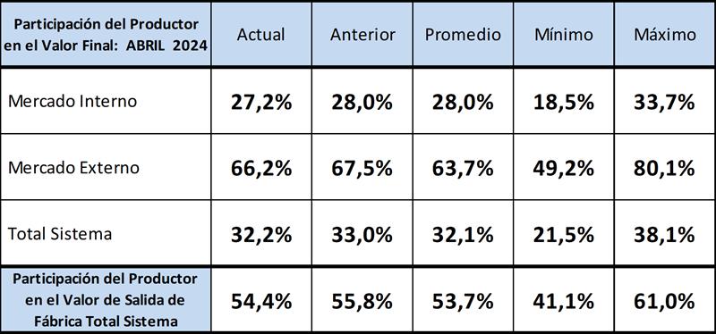 La participación del productor en el total del sistema fue para abril de 2024 del 32,2%, 0,8 puntos por debajo del mes anterior, y muy levemente por encima de la media del 32,1%. Empeoran los valores finales de mercado interno (-0,8) y los de mercado externo en 1,3 puntos porcentuales, superando a la media histórica de la serie disponible (63,7%). La participación del productor sobre el valor de salida de fábrica (precio al que vende la industria) fue de 54,4%, 1,4 puntos por debajo del mes pasado y 0,7 puntos por arriba del promedio de la serie (53,7%).