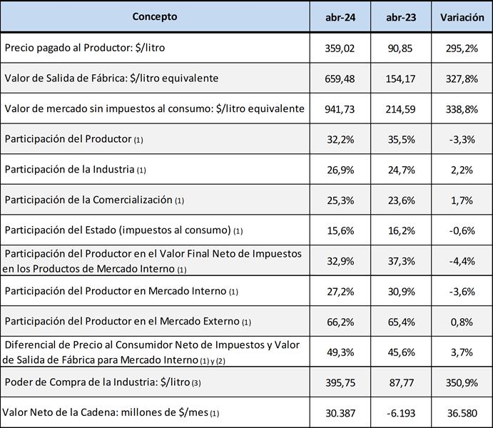 En primer lugar, se puede resaltar que el incremento interanual del precio de la leche al productor (295,6%), está por debajo del incremento del valor que paga el consumidor (338,8%), y el valor de salida de fábrica (precio al que vende la industria) 327,8%.