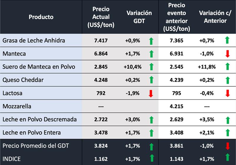-GDT Price Index indica el promedio del cambio porcentual en los precios para cada especificación, ponderado por la cantidad de cada especificación vendida. GDT proporciona un cambio en el índice de precios de GDT del evento anterior para todos los productos, además de un equivalente para cada grupo de productos y cada combinación de grupo de productos/período de contrato. El índice de precios proporciona un reflejo más preciso de los movimientos de precios entre los eventos comerciales.