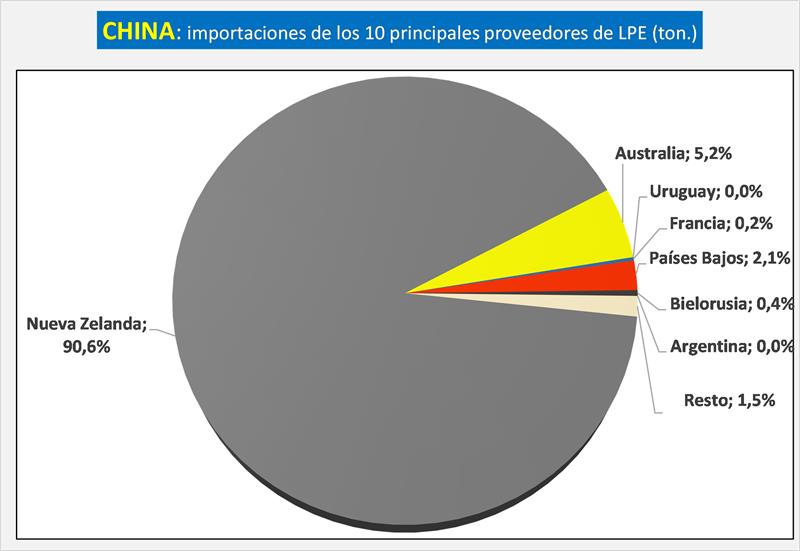 China es el principal importador de Leche en Polvo Entera y su principal proveedor es Nueva Zelanda quien ostentó el 90,6% de participación de ese producto en el gigante asiático en lo que va de 2024, casi idéntica a la participación del 2023 que fue del 91,3% para igual período.