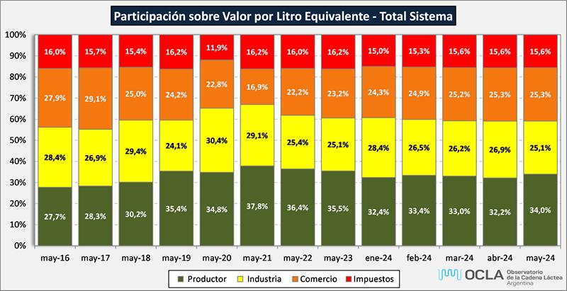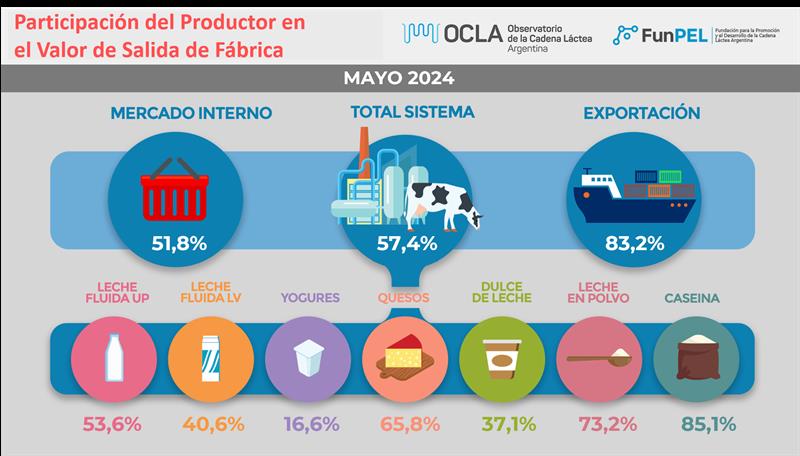 La participación del productor en el total del sistema fue para mayo de 2024 del 34,0%, 1,8 puntos por encima del mes anterior, y 1,9 puntos por encima de la media del 32,1%. Mejoran significativamente los valores finales de mercado interno (+1,5) y los de mercado externo en 4,1 puntos porcentuales, superando ampliamente a la media histórica de la serie disponible (63,7%). La participación del productor sobre el valor de salida de fábrica (precio al que vende la industria) fue de 57,4%, 3 puntos por encima del mes pasado y 3,7 puntos por arriba del promedio de la serie (53,7%).