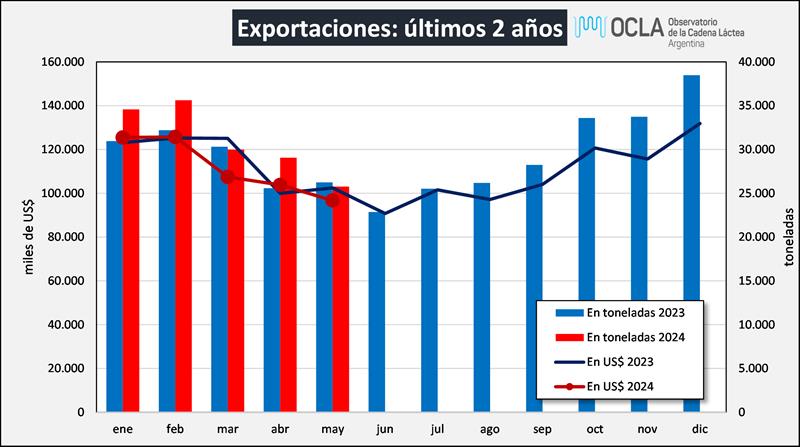 Las exportaciones de productos lácteos en mayo de 2024 que totalizaron 25.760 toneladas de productos, por un valor de US$ 96,7 millones, bajaron 11,3%, y 6,8% en volumen de productos, y en monto total en dólares, respectivamente, comparadas con el mes anterior.
