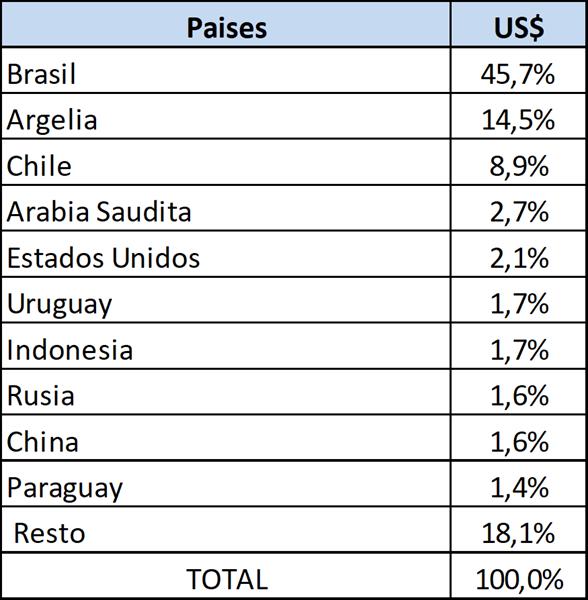 El destino de las exportaciones (en función al monto en dólares) se conformó: