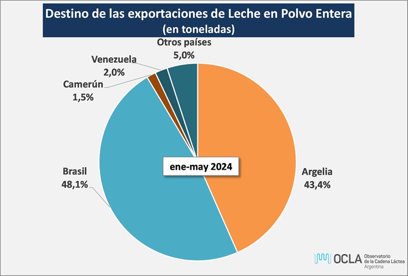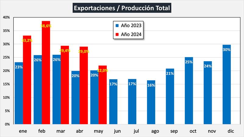 En litros de leche equivalentes (ene-may 2024), las exportaciones crecieron el 13,8% y representaron el 30,3% de la producción total (en los cinco primeros meses de 2023 representaron el 23,0%). En particular, en mayo de 2024 las exportaciones tuvieron una participación del 22,0% sobre la producción total del mes.