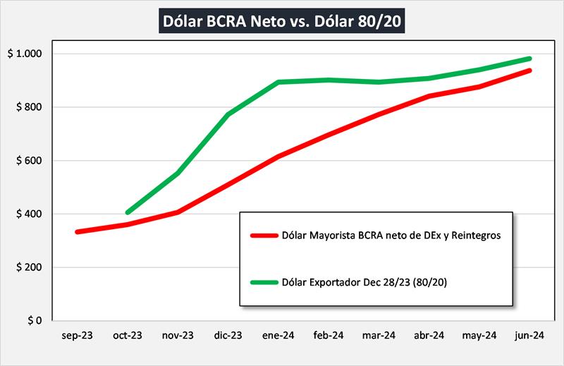 Debemos estar muy atentos a la evolución del tipo de cambio que luego de la fuerte devaluación en diciembre 2023, se viene ajustando a un ritmo muchísimo más lento que la inflación y posiblemente de continuar esta situación volvamos a valores de septiembre de 2023 (cuando había fuerte retraso cambiario y vigencia de derechos de exportación y reintegros) en junio, como puede verse en la simulación que realizamos en el gráfico siguiente, comparando el tipo de cambio efectivo de septiembre 2023 al cual actualizamos a junio 2024 por IPC con el tipo de cambio del Decreto 28/23 (80% mayorista BCRA y 20% Contado con Liquidación), los valores se igualan en junio, lo cual implica que se pierden las ventajas competitivas logradas por la devaluación de diciembre y por la suspensión de derechos de exportación.