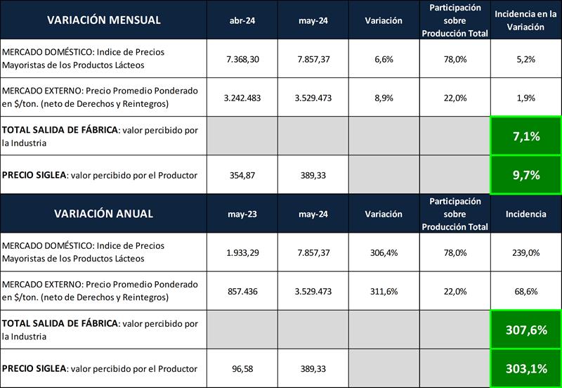 Este análisis trata de determinar la variación de precios de la industria y de la producción primaria. Se valoriza el ingreso de la industria en base a la proporción de leche que se destina a cada mercado y a los precios en que vende en cada uno de ellos. Para los precios de mercado interno se toma el Índice de Precios Mayoristas de los Lácteos de INDEC y para el mercado externo los precios en US$/ton., valorizados al tipo de cambio neto de exportación, en el caso del año anterior Dólar Mayorista BCRA neto de Derechos de Exportación y de Reintegros y para éste año el Dólar del Decreto 28/23 (80% dólar mayorista BCRA y 20% dólar contado con liquidación).
