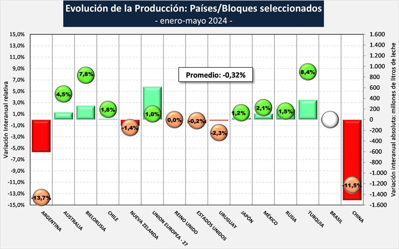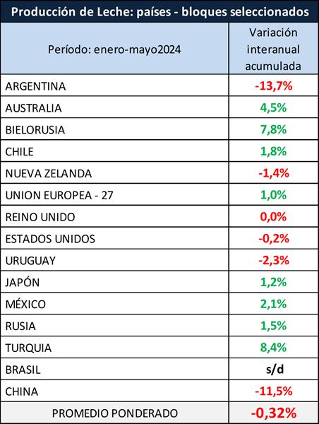 En el cuadro siguiente se toma un grupo seleccionado de los principales países que representan alrededor del 55% de la producción mundial de leche de vaca, en el cual se puede observar una disminución de la producción del 0,32%, para los primeros cinco meses del año 2024 respecto a igual período del año 2023.