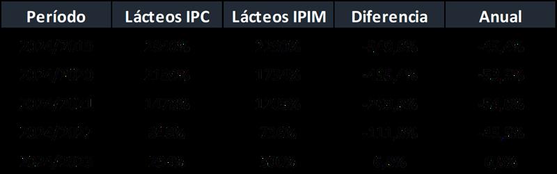 En el cuadro superior puede observarse que los precios de los productos lácteos en su versión mayorista (Salida de Fábrica: al que vende la industria), se incrementaron 16 puntos por arriba de mayorista general, y 31,3 puntos por encima qué su propia categoría Alimentos y Bebidas en la variación interanual. En 2024 respecto a ambos parámetros el precio de los lácteos ha venido recuperando fuertemente posiciones.